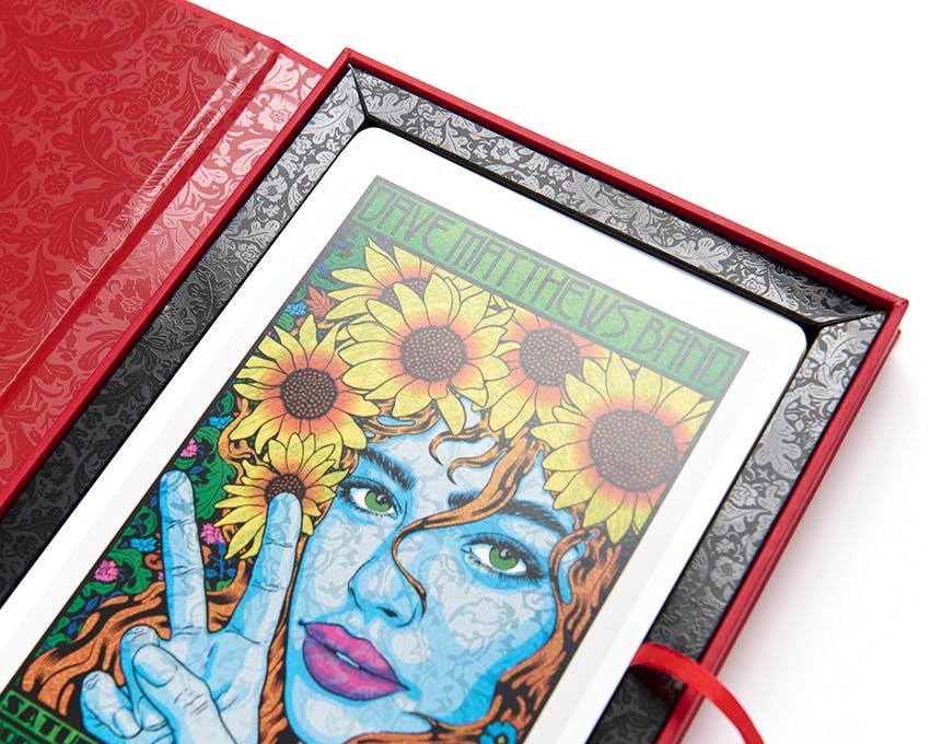 The set comes in a gorgeous red, smooth, sturdy portfolio fold box with a secure magnetic snap closure. Title and signature is in gold emboss. The inside cover is gloss printed with a beautiful oral pattern over red is the black bumper which snugly cradles the deck of poster cards. A red ribbon aids access to the sealed deck of 25 cards.